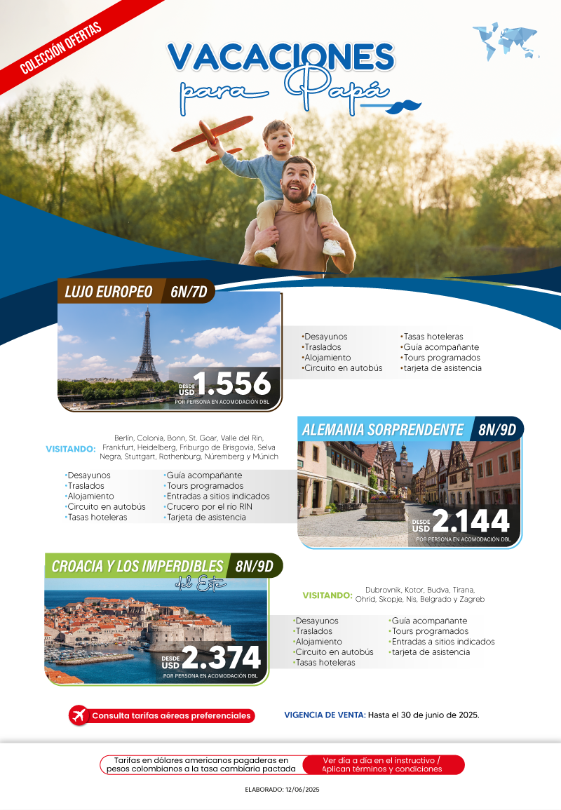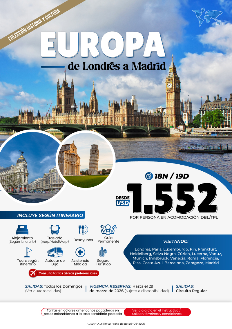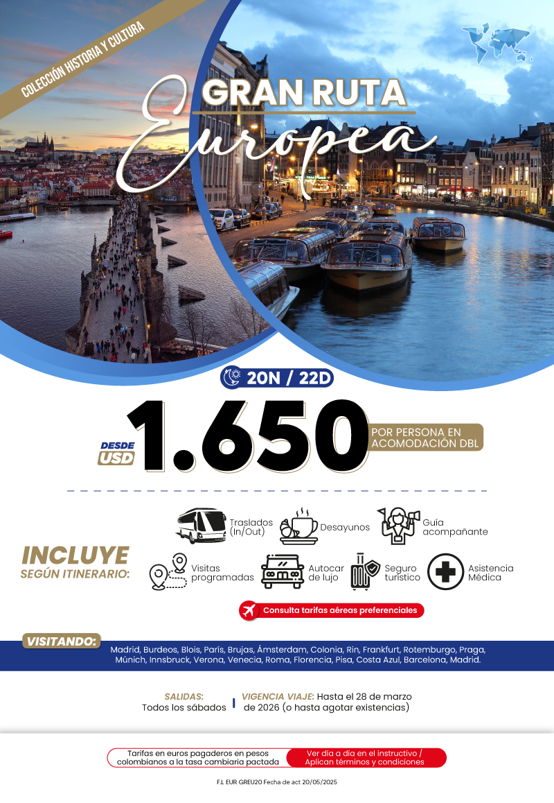 Madrid - Burdeos - Blois - París - Brujas - Ámsterdam – Colonia - Rin - Frankfurt - Rotemburgo – Praga - Múnich – Innsbruck - Verona - Venecia - Roma – Florencia - Pisa – Costa Azul - Barcelona – Madrid